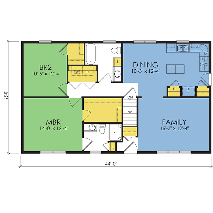A part of our dream series, the tamarack floor plan features 3 bedrooms and 1.5 bathrooms with a foot print of 44x30 feet and 1342 total square feet of living space.