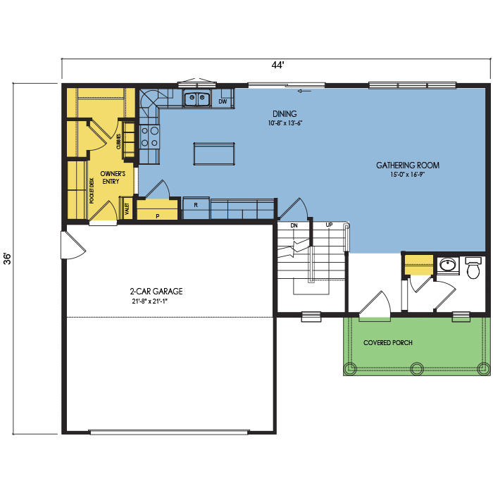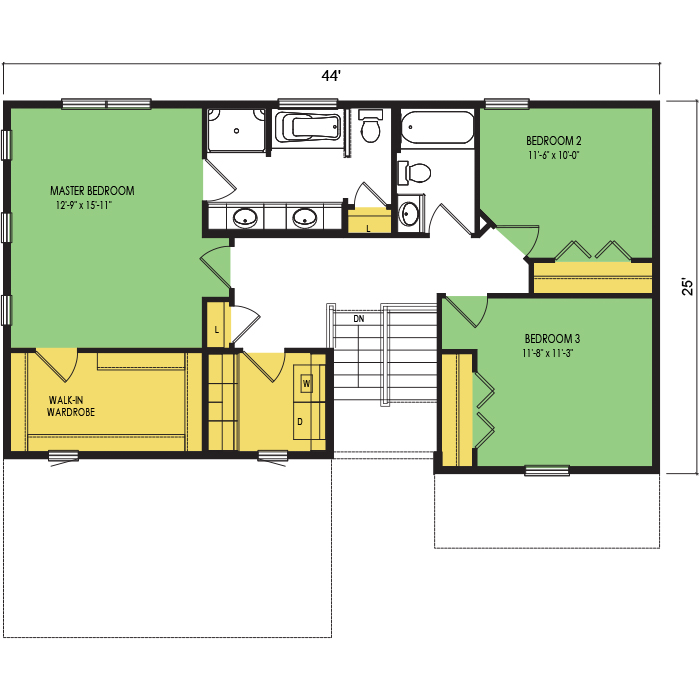 A part of our dream series, the tamarack floor plan features 3 bedrooms and 1.5 bathrooms with a foot print of 44x30 feet and 1342 total square feet of living space.