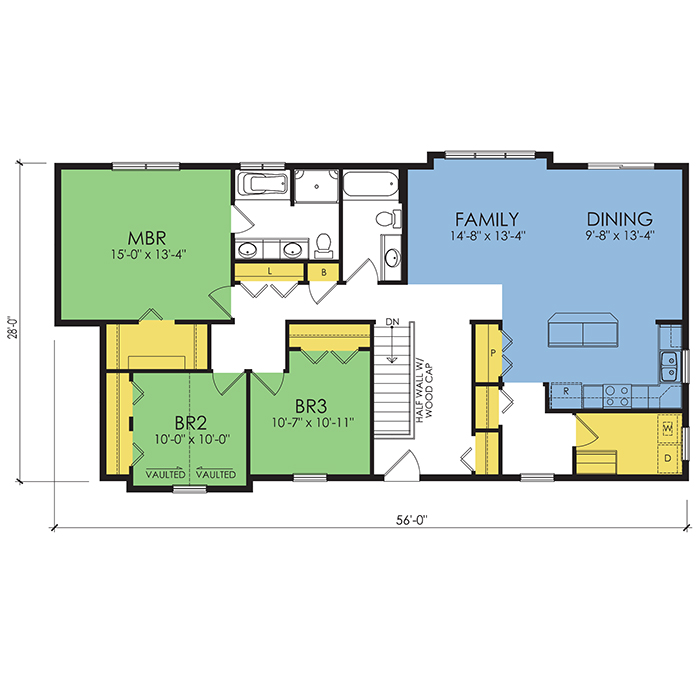 A part of our Wausau Originals, the Dunham floor plan features 3 bedrooms and 2 bathrooms with a foot print of 56x28 feet and 1535 total square feet of living space. Floor Plan #WO130