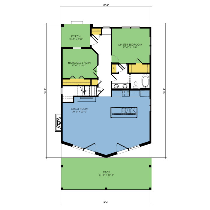 A part of our Vacation Series, the Kickapoo floor plan features 2 bedrooms and 1 bathroom with a foot print of 31x45 feet and 1248 total square feet of living space. Floor Plan #VL103